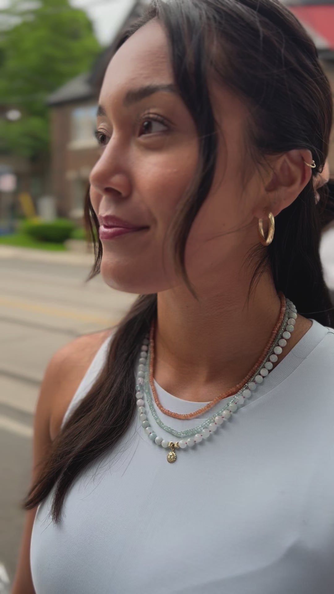 - Closer to the neck, layered with other necklaces